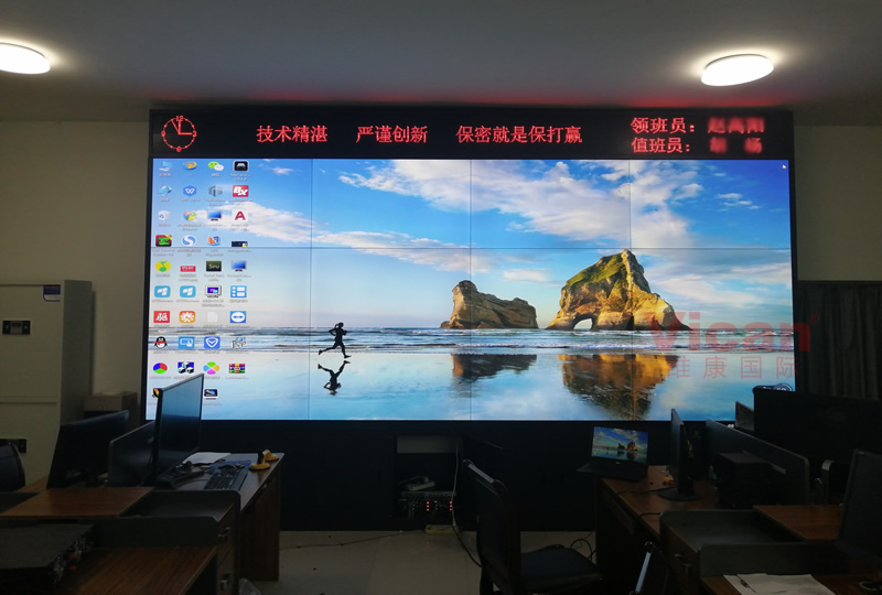維康國(guó)際為河南某部隊(duì)提供的這套會(huì)議大屏,采用3行4列、55寸液晶拼接屏,產(chǎn)品性能穩(wěn)定,超窄邊設(shè)計(jì),雙邊拼縫僅有0.88mm,如上圖所示,有著很好的畫(huà)面一體化顯示效果。