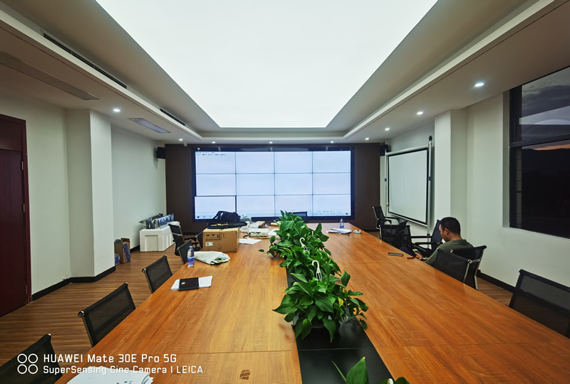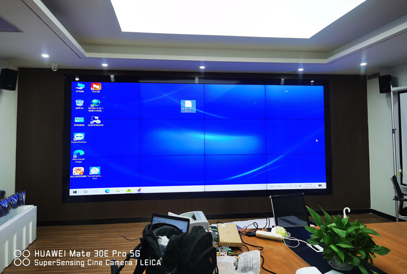 本案例中,維康國際為深圳市大鵬水利局提供了一套會議顯示大屏,由3x4、55寸液晶拼接屏組成,屏體為LG1.8mm原裝面板,采用前維護(hù)式安裝。
