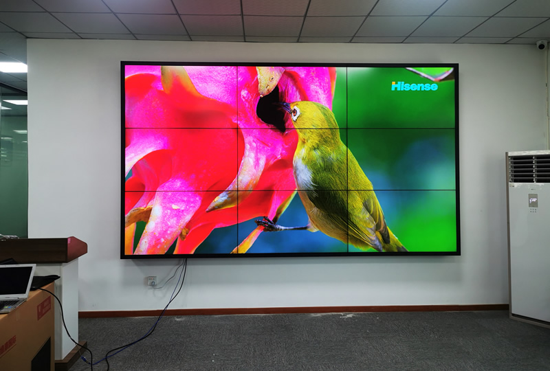 本案例中,維康國際為深圳市航天泛在科技園提供一套會議廳拼接屏,3.5mm拼縫的原裝面板,采用3*3拼接、前維護(hù)支架安裝加包邊處理,畫面顯示效果好,色彩鮮艷。