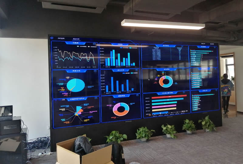 本案例中,維康國(guó)際為廣州市白云區(qū)某服裝電商公司提供一套大數(shù)據(jù)顯示屏,由3x4拼接、55寸超窄邊液晶拼接屏組成,采用點(diǎn)對(duì)點(diǎn)大數(shù)據(jù)顯示解決方案,讓大屏幕的分辨率更高、顯示更清晰細(xì)膩。