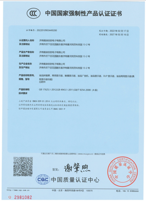 液晶拼接屏3C認證