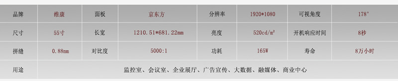京東方簡稱BOE,是知名的液晶面板制造商,提供大尺寸液晶面板、小尺寸手機屏等,在液晶拼接屏產(chǎn)品線中,尺寸及拼縫規(guī)格齊全。面板采用16:9比例,低能耗,待機功率只有0.5W。
